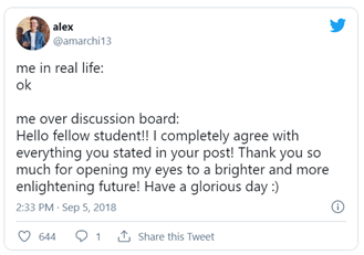 Martinez, K. (2019, September 21). 17 Tweets about discussion board posts that are brutally honest. BuzzFeed. https://www.buzzfeed.com/kellymartinez/students-on-discussion-board-posts-who-are-honestly-trying